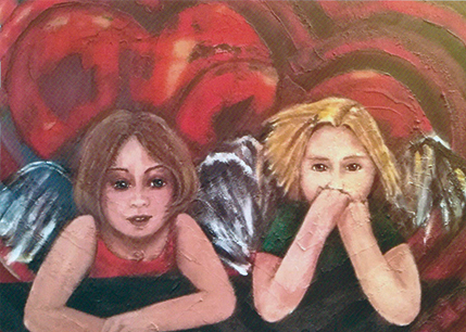 Ein Bild mit 2 Schutzengel und großen Herzen im Hintergrund wurde im Original mit Acryl auf Leinwand gemalt und wird hier als Druck angeboten.