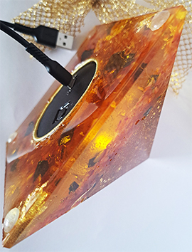 ► Auch den Stecker zum Aufladen bitte vorsichtig in die Buchse am Boden der Pyramide einführen. So erhalten Sie sich die Funktionalität der Musik-Orgonit Pyramide!
